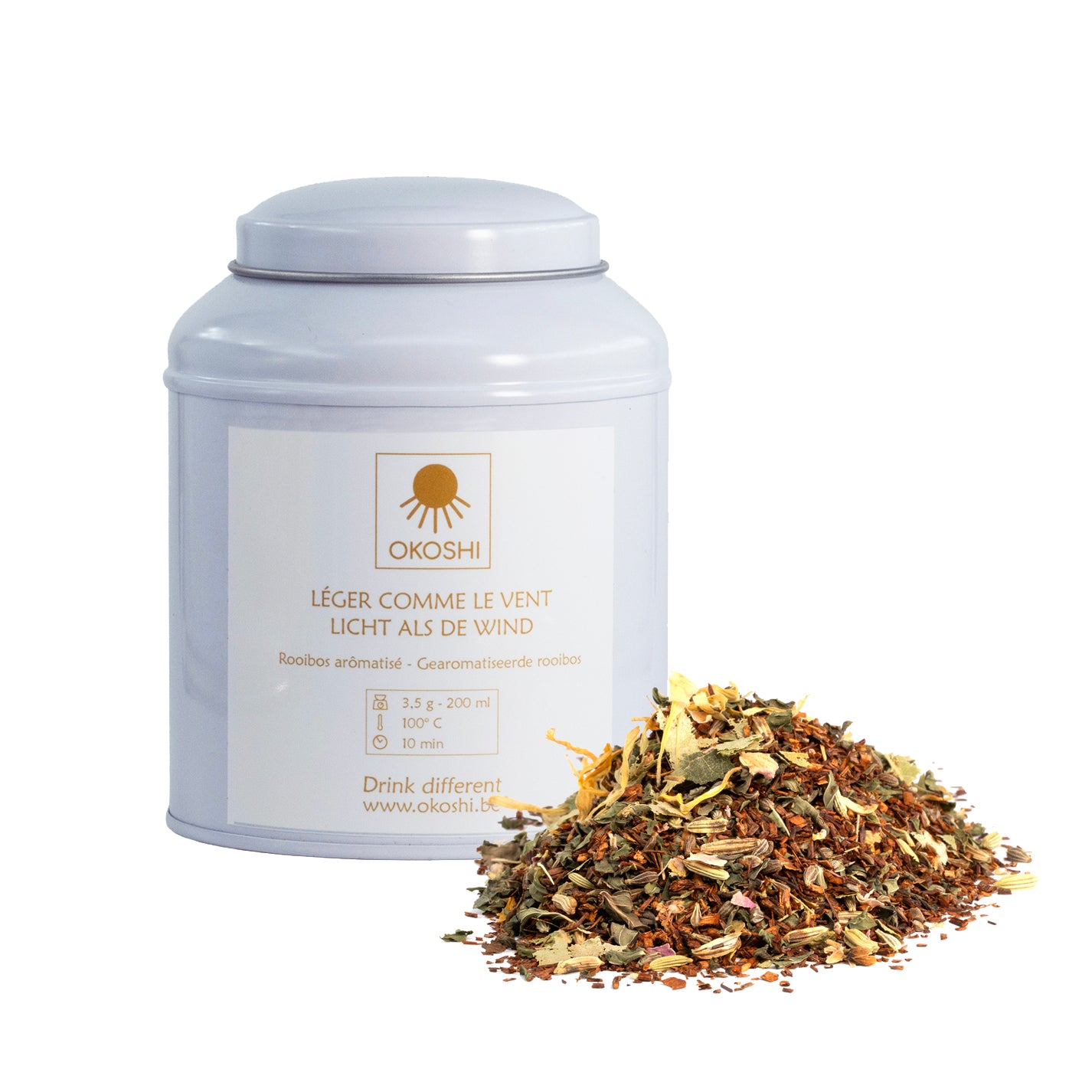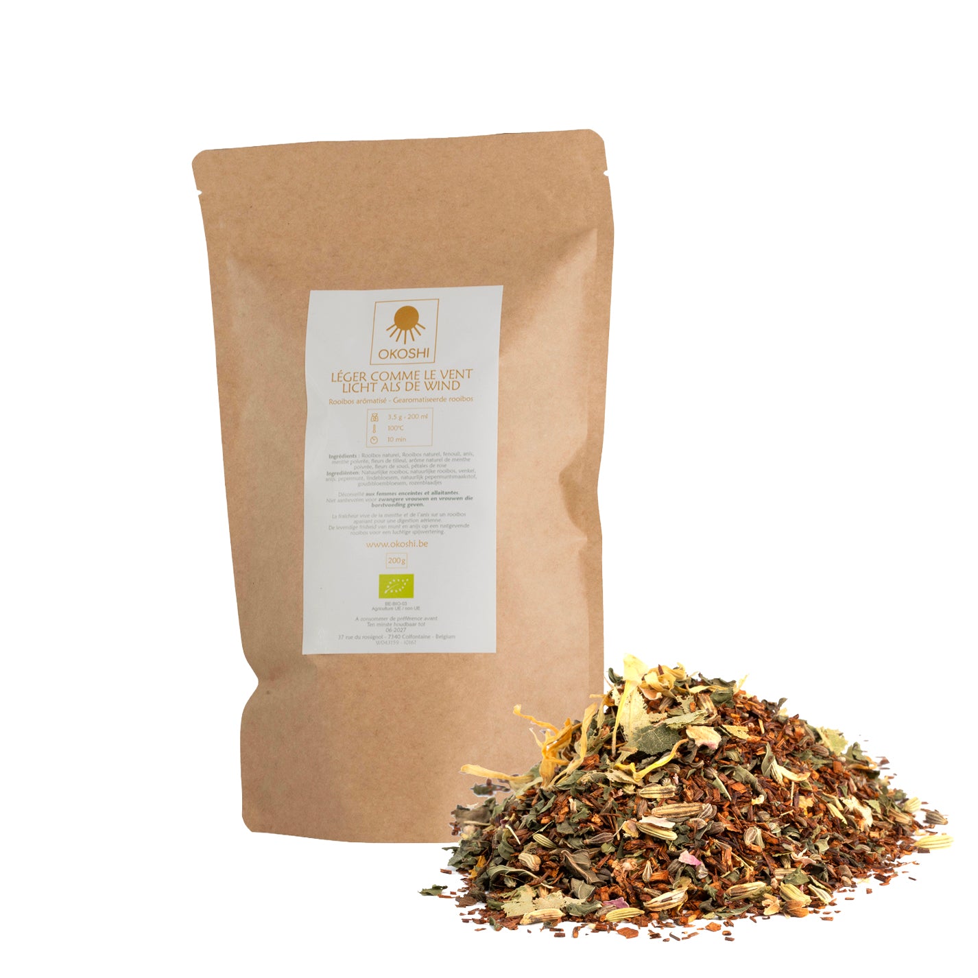 Zutaten: Rooibos naturel, fenouil, anis, menthe poivrée, fleurs de tilleul, arôme naturel de menthe poivrée, fleurs de souci, pétales de rose