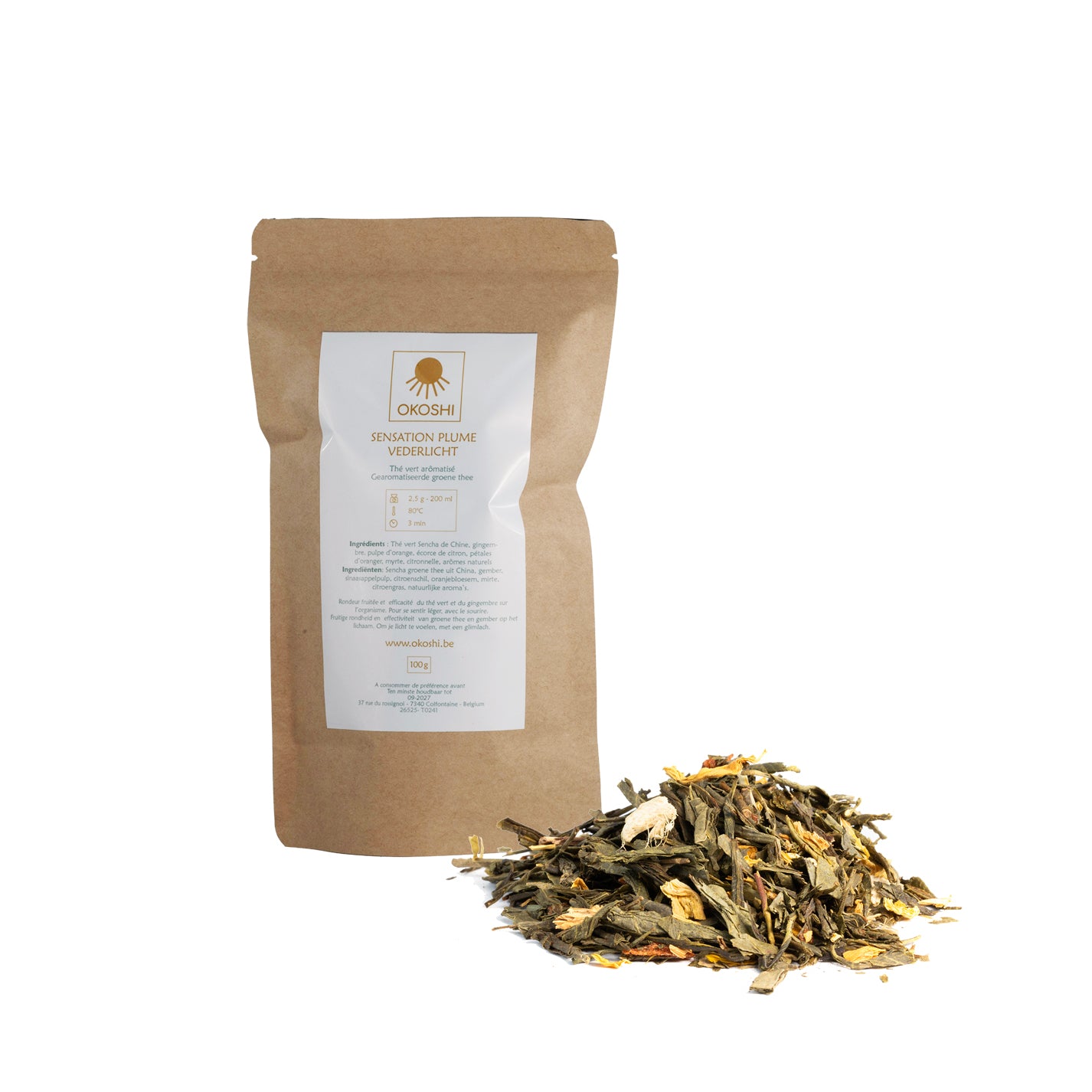 Ingrédients: Thé vert Sencha de Chine, gingembre, pulpe d'orange, écorce de citron, pétales de fleur d'oranger, myrte, citronnelle, arômes naturels